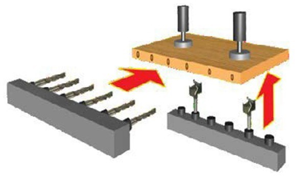Высокоточные сверлильно-присадочные станки предназначены для сверления сквозных и глухих отверстий в торцах и плоскостях мебельных щитов и брусковых деталей.