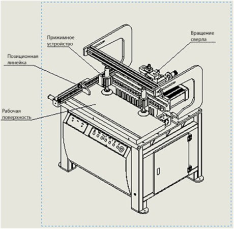 Конструкция сверлильной головы позволяет производить как вертикальное сверление (сверление в пласть), так и горизонтальное сверление заготовки (сверление в торец), а так же сверление под углом в 45°.