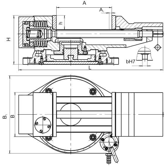 Зажим заготовки производится посредством пакета тарельчатых пружин, которые предварительно сжаты силовым механизмом. Силовой механизм представляет собой встроенный пневмогидроусилитель. Зажим заготовки тарельчатыми пружинами обеспечивает безопасность закрепления деталей при полном падении давления воздуха в сети. Номинальное давление воздуха 0,6 МПа.