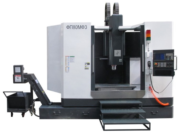 Базовая комплектация 1. Серводвигатели по 3-м осям; 2. Автоматическое устройство смены инструмента на 24 инструмента; 3. Масляный холодильник шпинделя; 4. Транспортер ленточный для удаления стружки; 5. Кабинетная защита зоны резания (3/4); 6. Рабочее освещение и светосигнальная колонна индикации состояния станка; 7. Автоматическая система смазки; 8. Пистолет для обдува воздухом рабочей зоны; 9. Система обдува конуса шпинделя при смене инструмента; 10. Система подачи СОЖ в зону резания; 11. Электрошкаф с теплообменником; 12. Сепаратор СОЖ; 13. Инструмент для обслуживания станка, анкерные болты и башмаки; 14. Паспорт станка (в составе руководства). Опции:   1. 4-я контролируемая ось, поворотный стол с ЧПУ (ФП80МФ4) - одновременное управления по 4м координатам 2. Кондиционер электрошкафа 3. ЧПУ Fanuc, МодМашСофт, БалтСистем 4. Оптические линейки по осям 5. Система подачи СОЖ под давлением 30 Бар 6. Устройство смывания стружки с дополнительным насосом 7. Устройство контроля обмера детали Renishaw 8. Автоматическое устройство настройки инструмента Renishaw 9. Пистолет СОЖ 10. ShopMill циклы визуального программирования от Siemens 11. Шпиндель BT40 12. редуктор шпинделя ZF - увеличение момента до 460 Нм без ограничения времени нагрузки (только для BT50) 13. Кабинетная защита зоны резания (4/4 +верх)