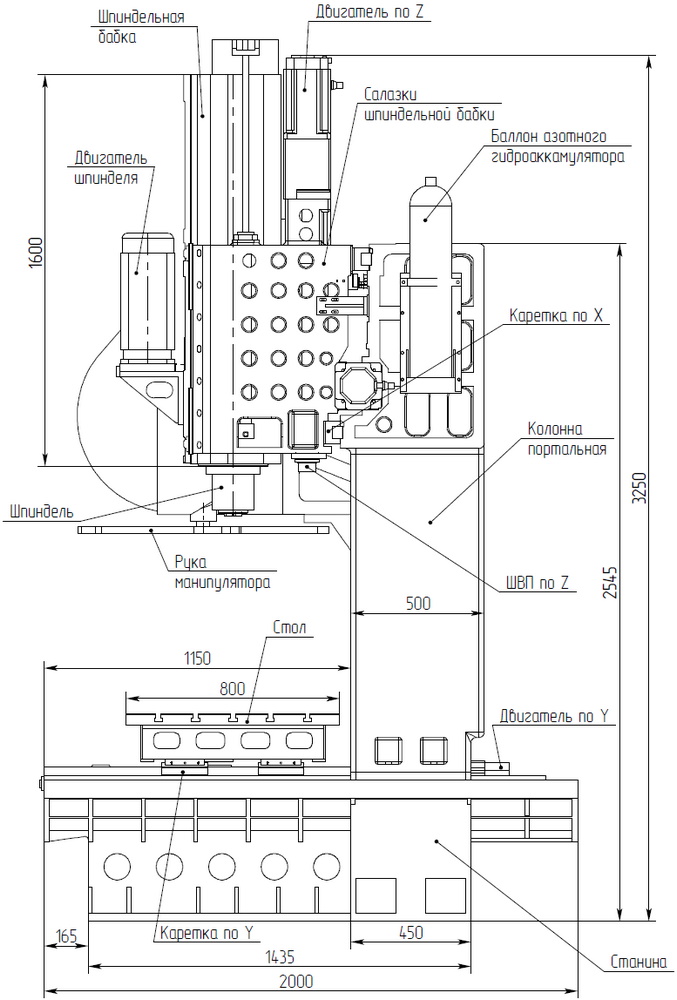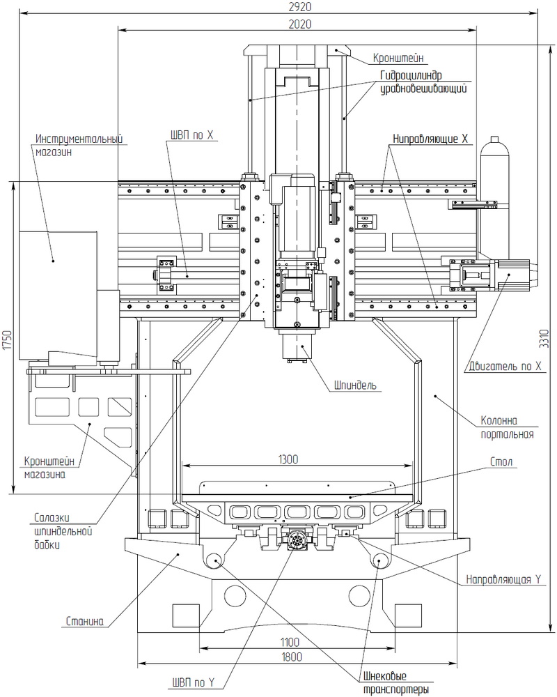 Станина Станина представляет собой чугунную отливку коробчатой формы, усиленную внутренними поперечными и продольными ребрами. На верхней плоскости по бокам станины крепятся профильные усиленные Х-образные роликовые рельсовые направляющие для перемещения стола по оси Y. Массивная чугунная станина станка эффективно поглощает вибрации при обработке Основание станка имеет 14 мест крепления анкерных болтов, что позволяет легко выставить станок по уровню и крепко зафиксировать станину на фундаменте. На станине справа и слева от направляющих выполнены в отливке два цилиндрических паза с небольшим уклоном в сторону оператора станка, предназначенные для установки двух шнековых транспортёров стружки. Колонна Колонна портальная представляет П-образную чугунную коробчатую конструкцию, имеет две опорные площадки для крепления на станину. Коробчатая конструкция колонны с рёбрами внутри обеспечивает высокую жесткость, уменьшая действие деформаций, возникающих во время ускоренных перемещений и обработки заготовок. 2 места крепления к основанию более равномерно передают нагрузки на основание. Станина и колонна портальная образуют основную несущую структуру, предназначенную для перемещения стола и салазок шпиндельной бабки. На верхнюю поверхность станины крепится поддон кабинета станка. Рабочий стол Прямоугольный, широкий стол с Т образными пазами идеально подходит для обработки корпусных и габаритных деталей. Стол перемещается только по координате Y - это обеспечивает большую грузоподъемность - до 1000 кг, точность, жесткость при обработке. Перемещение стола по направляющим осуществляется четырьмя каретками, которые расположены по две на каждой направляющей. По центру станины между направляющими находится шариковинтовая пара по оси Y, состоящая из винта, закреплённого на двух опорах к станине, и гайки, закреплённой на столе. С помощью вращения винта осуществляется перемещение стола относительно станины. Шпиндельная бабка, каретка Шпиндельная бабка представляет собой вытянутый параллелепипед, отлитый из чугуна с внутренней полостью. Длина шпиндельной бабки 1600 мм Горизонтальное перемещение салазок шпиндельной бабки по направляющим осуществляется шестью каретками, которые расположены по три на каждой направляющей (увеличивают жесткость системы при перемещении шпиндельной бабки). Профильные направляющие находятся на передней вертикальной поверхности колонны портальной, расположены горизонтально и одна закреплена по верхнему срезу колонны, другая – ниже на 650 мм. Между направляющими находится шариковинтовая пара по оси Х, состоящая из винта, закреплённого на двух опорах к колонне, и гайки, закреплённой на салазках шпиндельной бабки. Шпиндельная бабка перемещающаяся вертикально по 4-м коробчатым направляющим скольжения оси «Z» и имеет жесткую конструкцию. Идя дальше в создании нашего станка мы использовали передовые технологии и установили не противовес шпиндельной бабки, а гидроразгрузку (азотный цилиндр уравновешивания) - которая не только компенсирует вес шпиндельной бабки, но и минимизирует силы влияющие на все составляющие шпиндельного узла, в т.ч. исключает передачу ударных нагрузок и вибрации от режущего инструмента. Кинематика, система перемещения ШВП высокого класса точности и роликовые направля