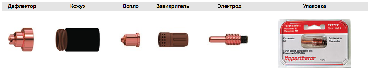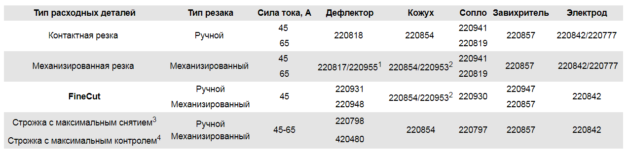 FineCut - это специальные расходные детали для резки тонкого листа с высоким качеством реза по сравнению со стандартным. Максимальный ток резки: 45 А Использование оригинальных расходных материалов HYPERTHERM обеспечивает постоянно высокое качество реза и увеличивает срок службы оборудования. Расходные материалы для Powermax 65_85_105 Расходные материалы для Powermax 65_85_105_таблица 1 Дефлектор для резки без защитного экрана; 2 Чувствительный к сопротивлению кожух; 3 Для интенсивного снятия металла, получения глубоких профилей строжки и тяжелых операций оплавления металла; 4 Для точного снятия металла, получения небольших профилей строжки и легких операций оплавления металла.