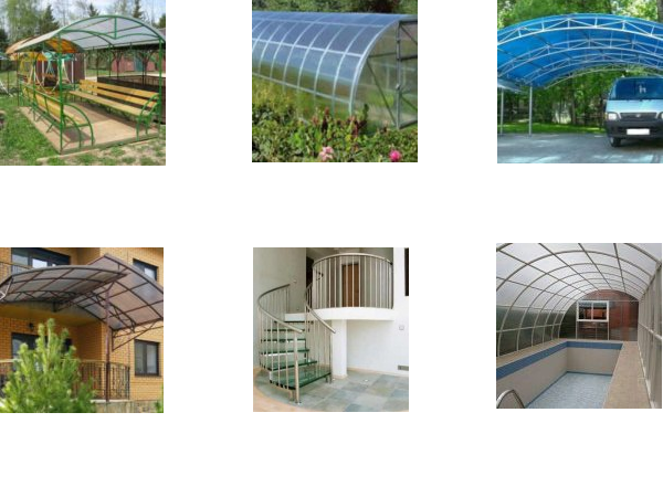 Различные виды продукции, которые можно изготавливать с помощью профилегиба ПГ-1:   Профилегиб ручной ПГ-1 находит широкое применение при производстве следующих видов продукции: теплицы своими руками, беседки своими руками, навесы, в том числе для бассейнов, козырьки, уличная и садовая мебель, офисные столы и стулья, спортивные тренажеры, стенки, спортивные и игровые площадки, поручни и ограждения для лестницы, в т.ч. для бассейнов, заборы, ворота и оконные решетки, кронштейны, кольца, дверные ручки и другие аналогичные изделия